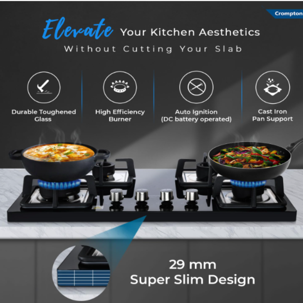 Crompton Kitchen Hob Super Slim (Model: TAB-SUHB784-MBL) is designed to bring style, efficiency, and precision to your modern kitchen. Featuring a sleek super slim design, this hob fits seamlessly into modular countertops while enhancing the overall look of your cooking space. Equipped with high-efficiency brass burners, it ensures even heat distribution for faster and more effective cooking. Built with durable materials and a premium finish, this kitchen hob offers reliable performance, easy maintenance, and long-lasting quality—perfect for everyday cooking needs.