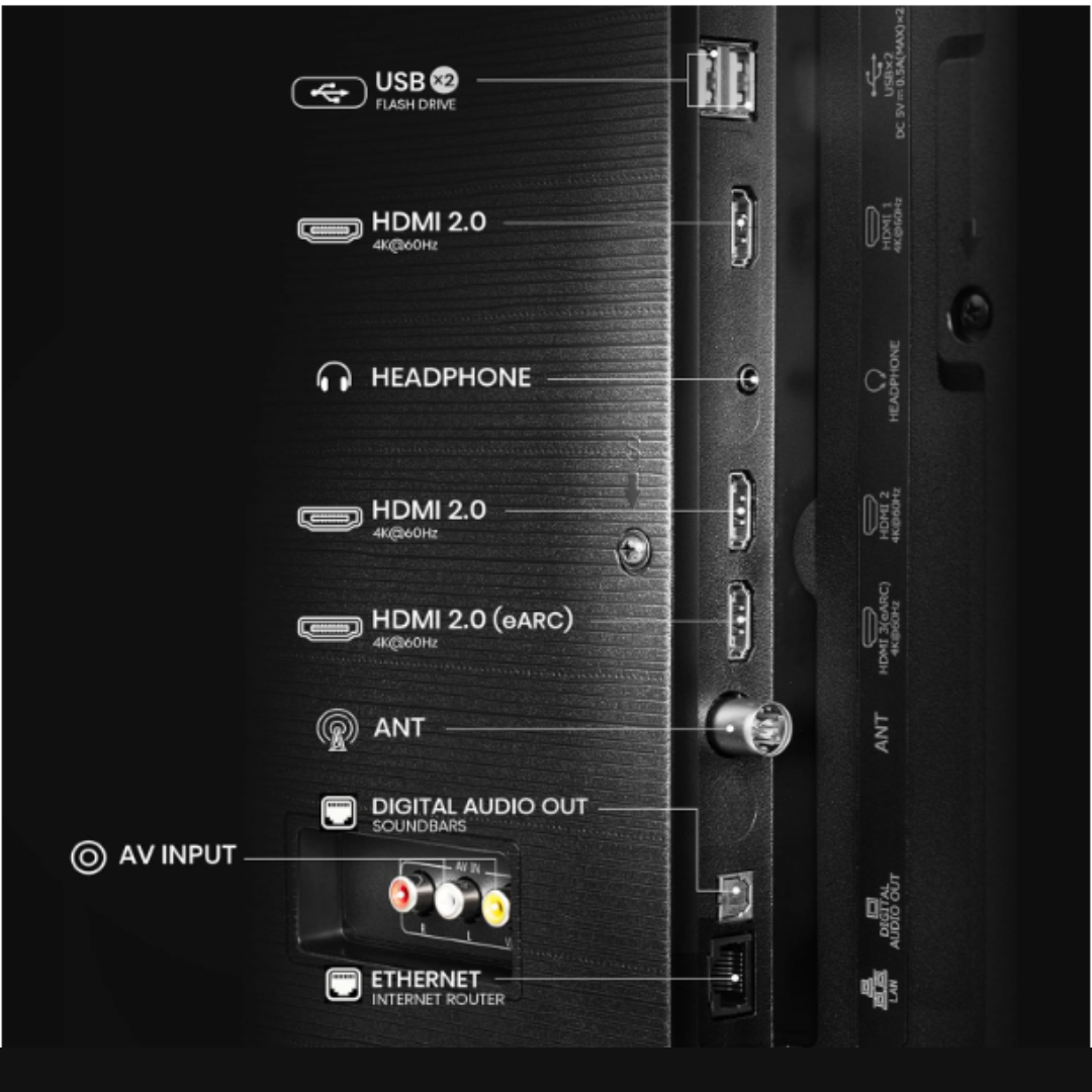 Multiple Connectivity Options: Includes HDMI, USB, Bluetooth, and Wi-Fi for versatile connections to gaming consoles, soundbars, and other devices.